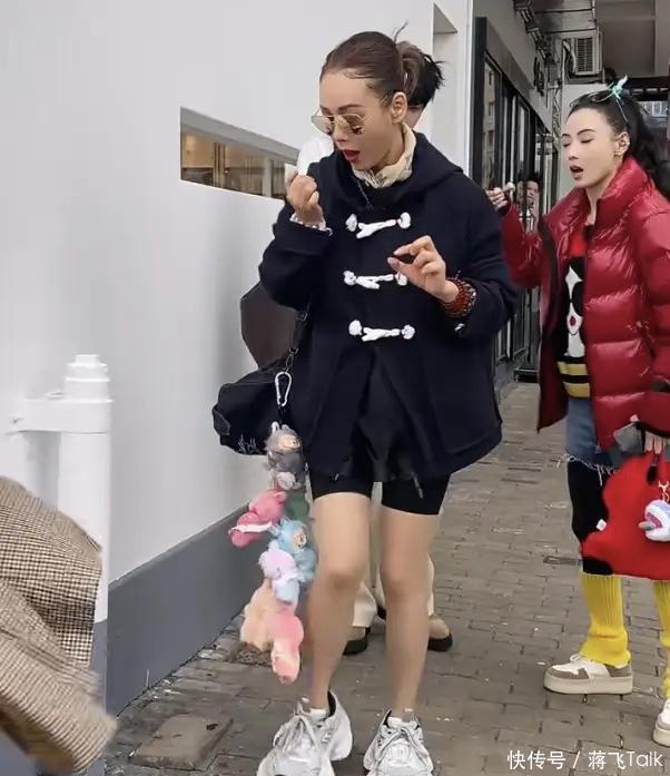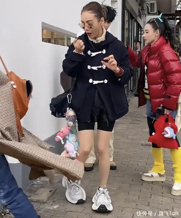 宁静上身穿着一件牛角扣的短外套,下身配了瑜伽短裤,有一种学生妹的既视感。还在包包上挂了一大串的labubu,真是太有童趣了。