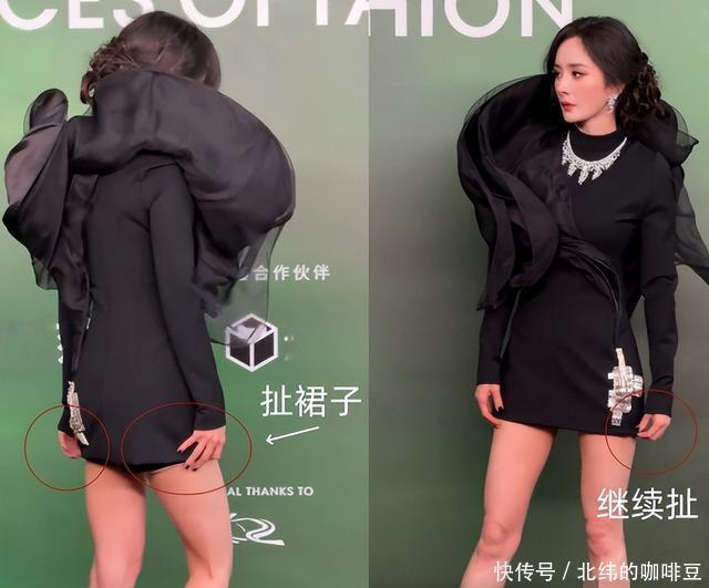 更灾难的是,设计师也太开放了,这超短裙短的杨幂都快走光了,只能一边勉强维持职业笑容,一边疯狂扯裙摆,再不扯打底裤都露出来了。