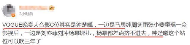 于是大家就很好奇:先不说刘亦菲是刘冲的心头好,即使刘亦菲没站到C位,在场还有那么多“影后”们呢,咋还让钟楚曦站了C位?